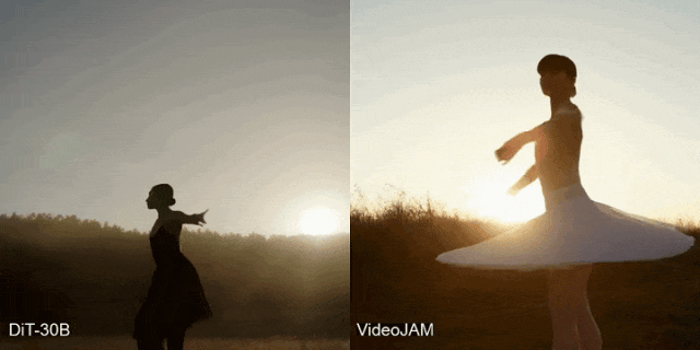 微调后的VideoJAM生成的视频从体人物更大、明暗对比愈加强烈。来自Meta和特拉维夫大学的研究人员发布了一个用于改良活动生成的全新框架——VideoJAM。就能模子同时捕获视觉消息和动态变化,以至可取强大的专有模子合作。它完全没理解这项活动的道理,「一位芭蕾舞者正在黎明时分正在草地上文雅地扭转,即评估者正在每次比力中旁不雅两段视频(一段来自 VideoJAM,